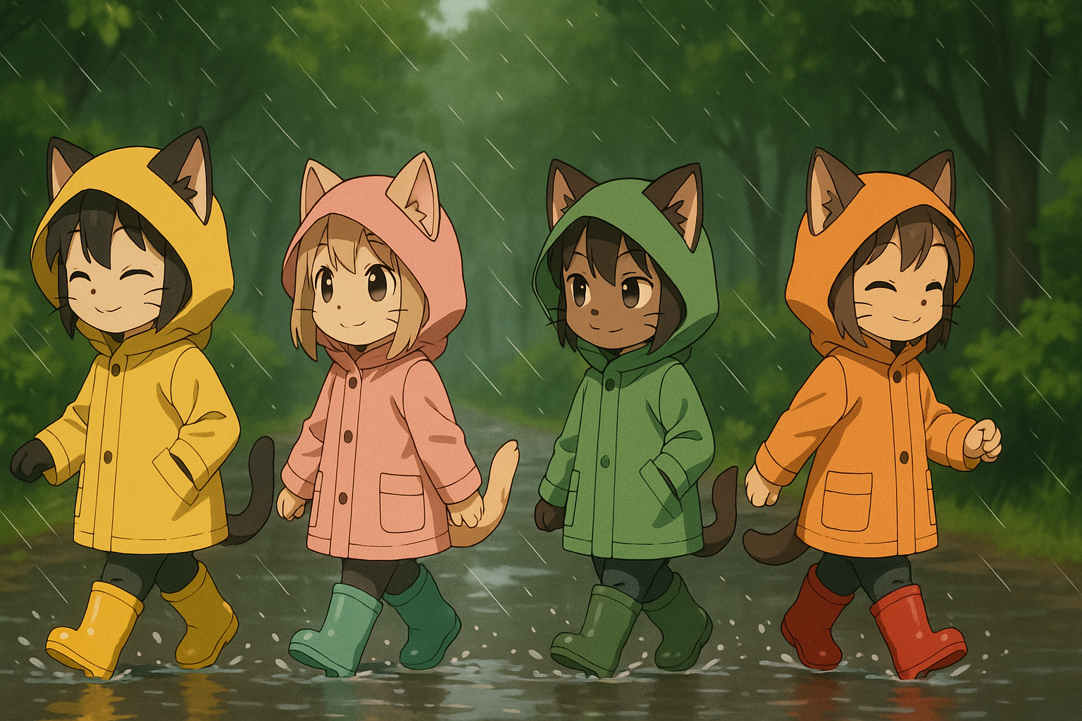 Walking through the village, I saw Nyaff tribe members ahead. They were going to the Large Tree Tower just like me. The Nyaff tribe happily sang while walking in a line. All of them wore raincoats. They were colorful, with ears and tails properly exposed. Seeing them lined up like that was quite cute.